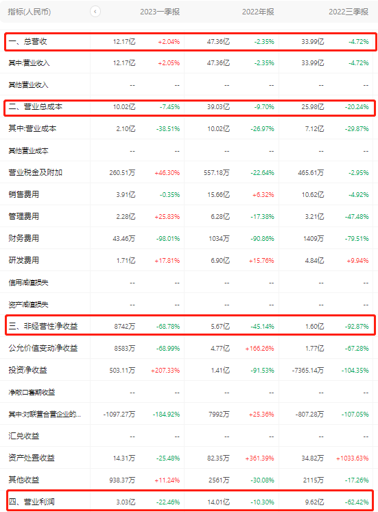 一季报亦然如斯,由于总营收12.17亿,比昨年同期还逆势飞腾2.04%,再加上总成本下落了7.45%,从这么的数据比值来看,这家企业一季报规划业务的利润比昨年同期应该有一个大幅增长。而目下利润反而下滑22.46%的情况,是跟非规划性收益下落近70%研讨。