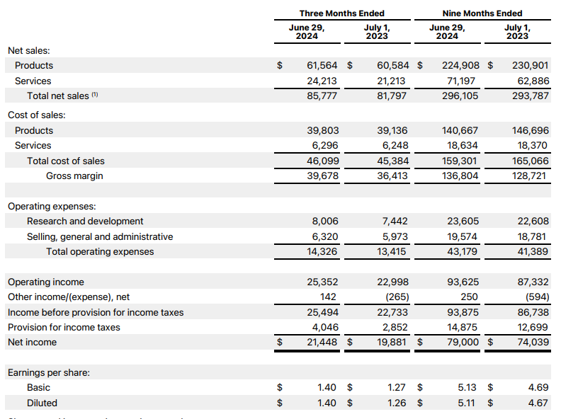当地时刻8月1日好意思股盘后,苹果发布了截止6月29日的2024财年第三财季财报。财报泄漏,苹果本季度罢了营收857.77亿好意思元,同比增长4.9%,高于分析师预期的844.6亿好意思元;非好意思国通用管帐准则下(Non-GAAP)净利润为214.48亿好意思元,同比增长7.9%;摊薄后每股收益(EPS)为1.40好意思元,同比增长11%,高于市集预期的1.35好意思元。