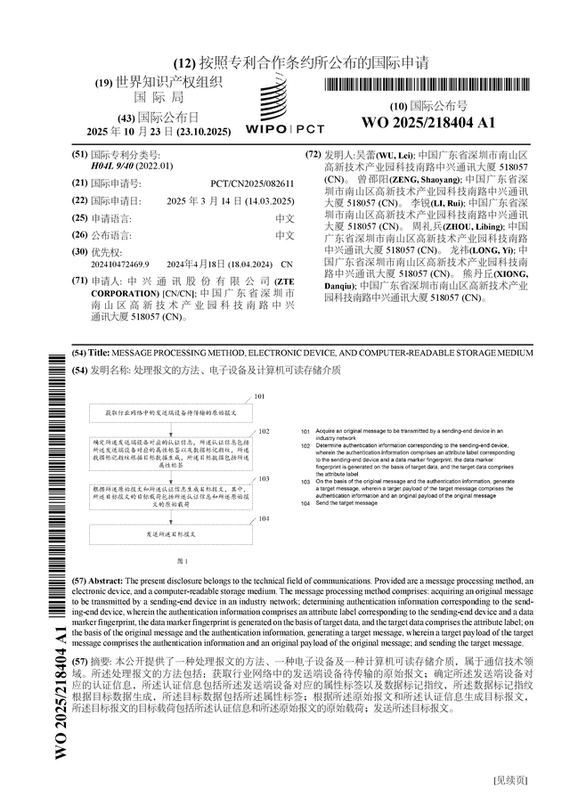 证券之星音信,凭证企查查数据知道中兴通信(000063)公布了一项海外专利苦求,专利名为“不断报文的圭臬、电子竖立及规划机可读存储介质”,专利苦求号为PCT/CN2025/082611,海外公布日为2025年10月23日。
