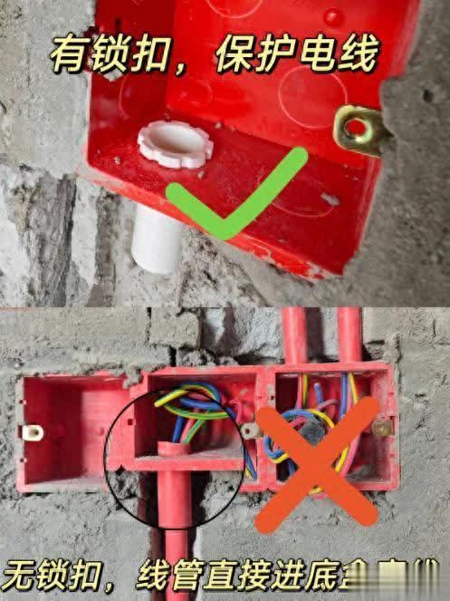 1、线盒和线管之间的锁母,90%的业主都不会属意到这个施工细节,因为关于工东谈主来说,详情是怎样省事怎样来,淌若径直把线管插进线盒里就不错,何须再给我方增多一谈措施呢?看起不起眼,但这个小东西的作用不可小觑,有了锁母,工东谈主在抽拉电线时,就不会因为狠恶的线管,导致线皮被磨损,有个锁母,工东谈主就必须标准施工,不会因为操作失当,导致后期线槽内的砂浆堵死管谈。