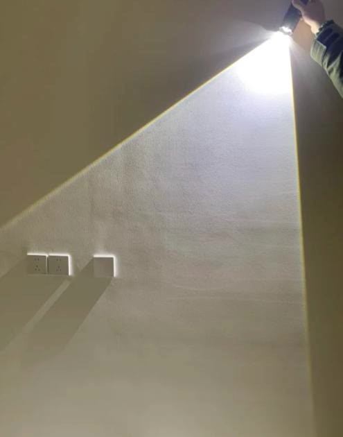 5、验收墙面平整度所用到的强光手电筒,宇宙都知谈,腻子打磨归天后需要验收平整度,一般都是用师父的大靠尺在墙面比划几下就算完事,这种验收款式不可说没用,只可说是验收的一部分,剩下的一部分是要通过手电筒来验收的,旨趣很肤浅,即是代替射灯模拟光照,从上往下打光,最佳在晚上进行,墙面平顽抗整、有莫得波涛纹,一照便知。