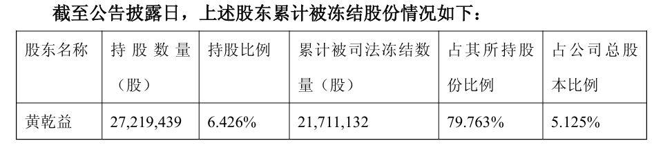 值得防御的是,黄乾益累计被法则冻结2171.11万股,占其所抓股份比例为79.763%。
